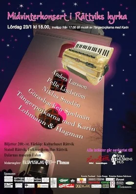 Midvinterkonsert med Anders Larsson, Pelle Lindström, Niklas Sundén, Görasbackens spelmän, Tängerpojkarna med Karin samt Nils & Putte. Välkomstmusik från kl 17. Förköp på Statoil (Rättvik), Kulturhuset (Rättvik), Folkmusikens hus (Rättvik) och Dalarnas Museum (Falun). Alla intäkter går oavkortat till Hagströminsamlingen och Folkmusikens hus. Midvinterkonsert med Anders Larsson, Pelle Lindström, Niklas Sundén, Görasbackens spelmän, Tängerpojkarna med Karin samt Nils & Putte. Välkomstmusik från kl 17.